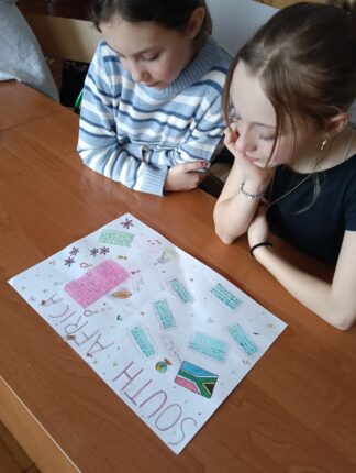 Temat: South Africa Uczniowie pracowali w grupach 3-4 osobowych. Wykonywali projekty o RPA przedstawiając interesujące fakty na temat tego pięknego kraju.Na koniec prezentowali swoje prace w języku angielskim przed całą klasą.