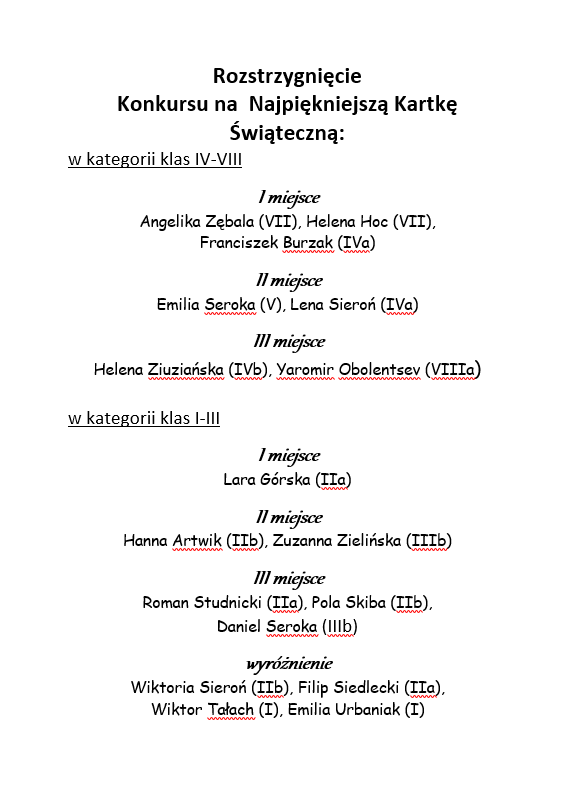 W grudniu do biblioteki szkolnej dotarły piękne projekty kartek świątecznych, dostarczone przez uczniów na Konkurs na Najpiękniejsza Kartkę Świąteczną. Doceniamy mobilizację uczestników konkursu, którzy znaleźli czas i ochotę na wykonanie prac, tym bardziej, iż wiadomo powszechnie, że wszyscy zaabsorbowani byli wówczas intensywnymi przygotowaniami do Kiermaszu Bożonarodzeniowego. Bardzo dziękujemy! Zapraszamy do obejrzenia galerii na platformie Wordwall.